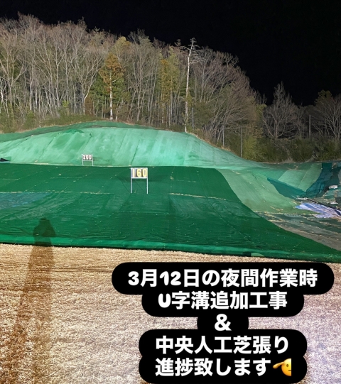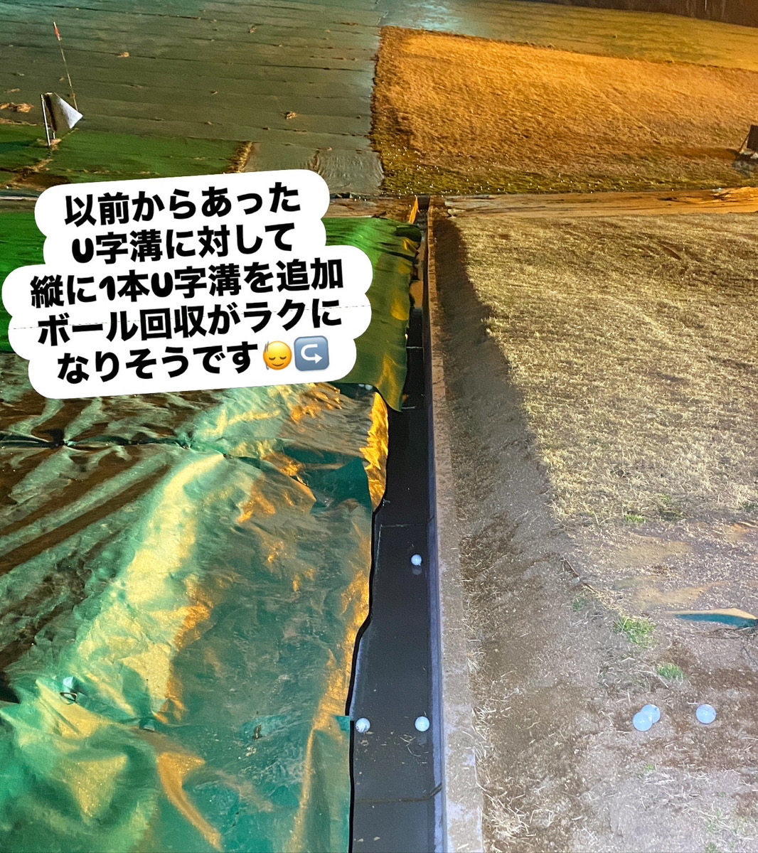 2月〜始まりました「U字溝追加工事作業」の進捗ですが、中央傾斜手前に以前からあったU字溝へ新たに追加して繋げて、中央傾斜を利用して自然とボールがU字溝に入る様に致しました👍